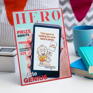 Genialne dziecko, na które już czeka nagroda Nobla – brzmi prawie jak opis Twojego potomka, prawda? Z Baby Foto Ramką – HERO możesz w ułamku sekundy zobaczyć je na okładce prestiżowego magazynu, która to potwierdzi. Wystarczy tylko wsunąć fotografię o rozmiarach 10×15 cm w odpowiednie miejsce i gotowe – na pierwszy rzut oka trudno rozróżnić ramkę od prawdziwej gazety! To oryginalna ozdoba do pokoju dziecka czy salonu – na pewno przyciągnie wzrok gości i będzie ciekawym tematem do rozmów.