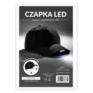 – czapka posiada 5 diod LED zaszytych w daszku- dwa włączniki: jeden na module zasilania, drugi zaszyty w daszku- aby zaświecić diody, na module zasilania ustaw przełącznik w pozycji ON, a następnie naciśnij przycisk ukryty w daszku – baterie w zestawie- rozmiar uniwersalny, z możliwością regulacji paska