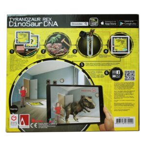 – Pozwala na wykopanie świecącego szkieletu dinozaura oraz pojemnika z naklejkami z jego DNA, które należy przykleić na specjalną matę- Zestaw dodatkowo wykorzystuje technologię rozszerzonej rzeczywistości (AR)- Specjalna aplikacja pozwala zobaczyć projekcję dinozaura naturalnej wielkości, a nawet zrobić sobie z nim zdjęcie- Zdjęciami i filmami z dinozaurem można podzielić się ze znajomymi w mediach społecznościowych- Zawartość zestawu: bryła gipsu zawierająca pojemnik z naklejkami przedstawiającymi fragment DNA dinozaura oraz świecący szkielet dinozaura, zestaw narzędzi do przeprowadzenia wykopalisk, pędzelek, 2 maty edukacyjne oraz szczegółowa instrukcja