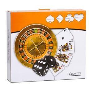 – komplet do gry w ruletkę, Black Jack’a, pokera i kości- zawartość zestawu: koło do ruletki z dwiema metalowymi kuleczkami, 2 maty filcowe, 100 żetonów (białe, niebieskie, żółte i czerwone), 4 kości, talia kart, grabki krupiera, krążek Dealera (Krupiera), instrukcja- jedna mata (do ruletki) jest jednostronna, druga mata – dwustronna (do Black Jack’a oraz kości)- sposób na rozkręcenie imprezy w domu