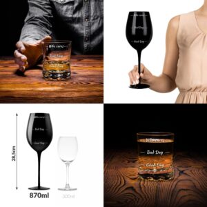 W skład zestawu wchodzi szklanka do whisky i gigantyczny kieliszek do wina.Oba gadżety mają zaznaczone trzy poziomy napełnienia, dzięki którym można nabrać trochę dystansu do rzeczywistości i z poczuciem humoru dać znać drugiej osobie, w jakim jest się nastroju.Całość jest zapakowana w eleganckie i wytrzymałe etui, które chroni szkło i pozwala zabrać je ze sobą wszędzie. Nadaje się też do wręczenia na prezent od razu, bez dodatkowego pakowania.