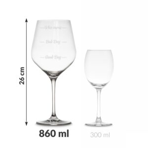Gigantyczne kieliszki w zestawie są dwa – bo we dwoje zawsze raźniej! Kuszą nie tylko wyglądem i pojemnością, ale i nadrukiem z przymrużeniem oka, idealnym na każdy nastrój.Dobry dzień od złego różni się tylko ilością alkoholu wypitą na jego koniec, dlatego znajdziesz na nich trzy poziomy napełnienia: Good Day, Bad Day, Who cares.Dzięki nadrukowi łatwiej spojrzeć na rzeczywistość z dystansem, a dzięki gigantycznej pojemności o dolewki nie trzeba się martwić.