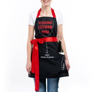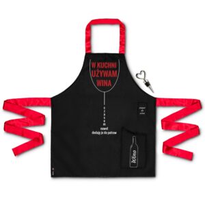 Z przymrużeniem oka: Przepis na sukces w kuchni? Używaj więcej wina! Odrobina do risotto, trochę do mięsa, najlepiej jednak… do pojemnego kieliszka. Jeśli znasz damę, która o gotowaniu myśli podobnie, a do tego ma poczucie humoru, podaruj jej fartuszek z napisem: W kuchni używam wina. Czasami nawet dodaję je do potraw.