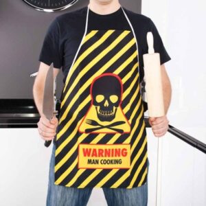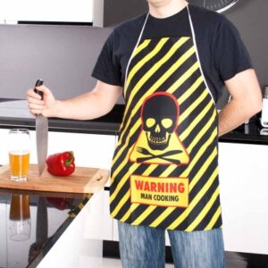 Kuchenny fartuch dla mężczyzny z napisem w języku angielskim.