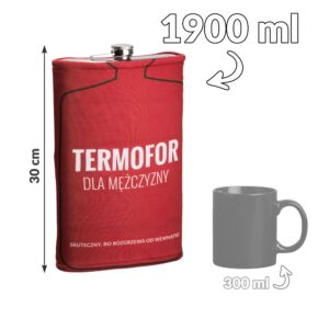 Gdy na dworze ziąb i plucha zachęcamy do sięgnięcia po specjalny termofor dla mężczyzny, pełen rozgrzewającego od środka płynu. Gigantyczna piersiówka – Termofor dla mężczyzny jest idealnym lekiem na chłód, złamane serce, ciężki dzień i słabą imprezę. Jej gigantyczna pojemność pozwoli walczyć z przeciwnościami losu i pogody w grupie (dzieląc się napojem z innymi) lub zatrzymać zapas na czarną godzinę.