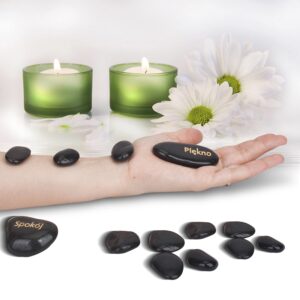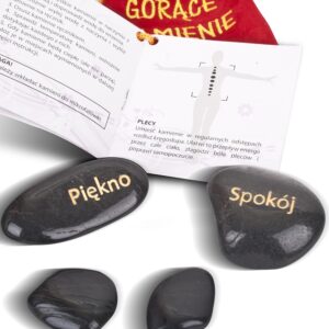 – zestaw zawiera naturalne kamienie, które mogą się różnić kształtem i wielkością od tych widocznych na zdjęciach- 3 największe kamienie mają wygrawerowane napisy- kamienie należy umieścić w gorącej wodzie, zgodnie z instrukcją- UWAGA! Kamieni nie należy wkładać do mikrofalówki!