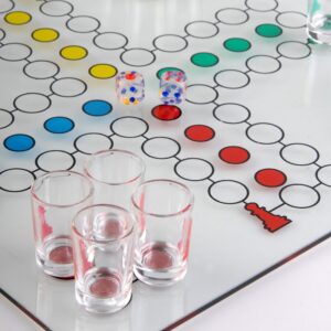 – w zestawie: szklana plansza o wymiarach 31 x 31 cm, 2 kości do gry oraz 16 małych plastikowych kieliszków imitujących pionki