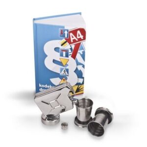 Imprezowy Kodeks Drogowy tylko z zewnątrz wygląda jak najmniej pożądana książka świata. Wystarczy ją jednak otworzyć, by oczom (początkowo zdegustowanego) solenizanta ukazała się lśniąca piersiówka w kształcie kanistra oraz dwa wysuwane kieliszki teleskopowe. Efekt zaskoczenia i zadowolenia gwarantowany!