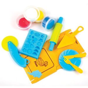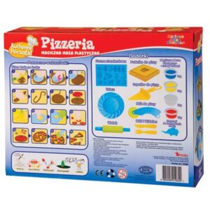 Jeśli lubisz smakołyki lub marzysz o karierze kucharza w światowej sławy restauracjach, ten zestaw pomoże Ci spełnić Twoje dziecięce marzenia i pozwoli na kuchenne eksperymenty za pomocą magicznej masy plastycznej.Pizzeria to zestaw, który umożliwi niezapomnianą zabawę poprzez tworzenie różnorodnych potraw kuchni włoskiej tj. pizzy czy spaghetti. W zestawie znajdują się 4 masy w czterech podstawowych kolorach: żółtym, niebieskim, czerwonym oraz białym, a także specjalne narzędzia i akcesoria niezbędne do zabawy. Masa plastyczna przypomina leciutką piankę i formuje się łatwo – jak plastelina. Po uformowaniu należy pozostawić ją do wyschnięcia, co spowoduje jeszcze większą utratę wagi. Można pomalować ją farbami.