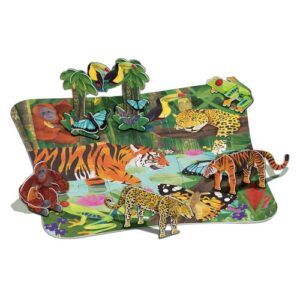 Puzzle 3D – Dżungla to przestrzenna układanka dla dzieci, która gwarantuje doskonałą zabawę na kilku płaszczyznach jednocześnie. Płaskie papierowe puzzle przedstawiają scenerię z lasu deszczowego, a dołączono do nich trójwymiarowe szablony zwierząt żyjących w dżungli. Po ułożeniu całej układanki trójwymiarowe zwierzęta mogą posłużyć dzieciom do dalszych zabaw!