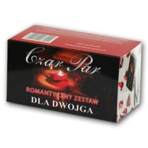 Na romantyczny zestaw dla dwojga składają się:1. Dwie pływające świece w kształcie serca o zapachu róży, bardzo estetycznie opakowane, każda oddzielnie w celofan z kokardką.2. Ozdobne pudełko zapałek z czarnymi zapałkami o czerwonym czubku, które współgrają z romantycznym nastrojem.