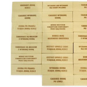W zestawie znajdują się 54 klocki z czego aż 30 posiada napis z następującymi poleceniami:Całujesz osobę po prawejCałujesz osobę po lewejCałujesz wybraną osobęOsoba po prawej ściąga jedną rzecz Wszyscy oprócz Ciebie ściągają jedną rzeczWybrana osoba ściąga jedną rzeczUbierasz jedną rzeczMówisz wszystkim romantyczne komplementy przez całą kolejkęWyznanie lub wyzwanie dla osoby po lewej Wyznanie lub wyzwanie dla wybranej osobyRobisz Minę Miłosnego UniesieniaZamieniasz się miejscem z wybraną osobą