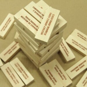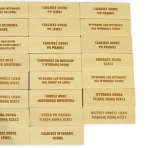 Ale to nie wszystko! Żeby dodać grze odrobinę pikanterii, klocki posiadają napisy z poleceniami, które należy wykonać! Jeśli jednak z jakiegoś powodu nie chcesz tego zrobić to w zamian musisz wykonać skomplikowane zadanie lub odpowiedzieć szczerze na osobiste pytanie.