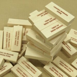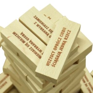 – Kultowa gra w nowym wydaniu- W zestawie 54 klocki (30 sztuk posiada napis)- Napisy na klockach w języku polskim- Wymiar pojedynczego klocka: 7,5cm x 2,5cm x 1,3cm