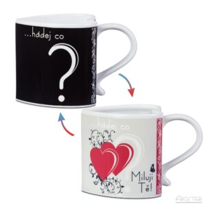 – kubeczek, który pomoże Ci wyrazić swoje uczucia- dzięki specjalnej farbie zmienia się pod wpływem ciepła, odkrywając napis „Kocham Cię!”- po wystygnięciu lub zalaniu zimną wodą wraca do stanu początkowego- Zaskakujący Kubeczek jest chroniony zarejestrowanym znakiem towarowym