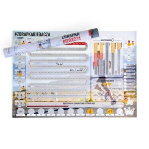 Dla kogo:Ten gadżet został zaprojektowany z myślą o wszystkich pasjonatach biegania, nawet tych którzy preferują nietypowe biegi. Równie dobrze sprawdzi się jako prezent dla kogoś, kto dopiero zaczyna biegową przygodę, jak i dla doświadczonego maratończyka, a nawet ultramaratończyka. To bez znaczenia, czy ktoś pokonuje dystans 5 czy 50 kilometrów tygodniowo – zawsze będzie co zdrapać. Każda sekcja na plakacie to inna inspiracja lub wyzwanie dla biegacza, m.in.: całkowity dystans; rekordowy czas na 1, 5 i 10 km, życiówka w półmaratonie i maratonie; zawody biegowe w całej Polsce; nietypowe biegi. Sprawdzi się doskonale jako prezent dla taty biegacza, biegającej mamy, syna czy córki.
